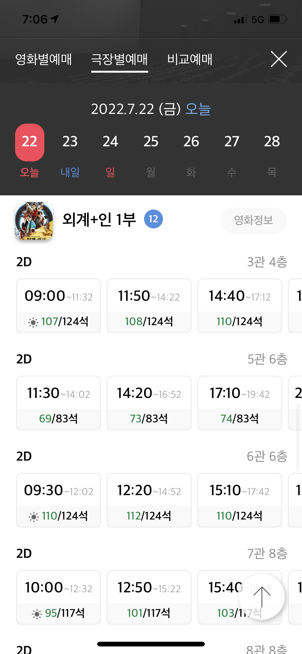 이게 cgv 오늘 예매 시간표. (우리동네) 오전 아홉시 조조영화로 외계인을 보려고 했는데 가격 보고 기겁했잖어.