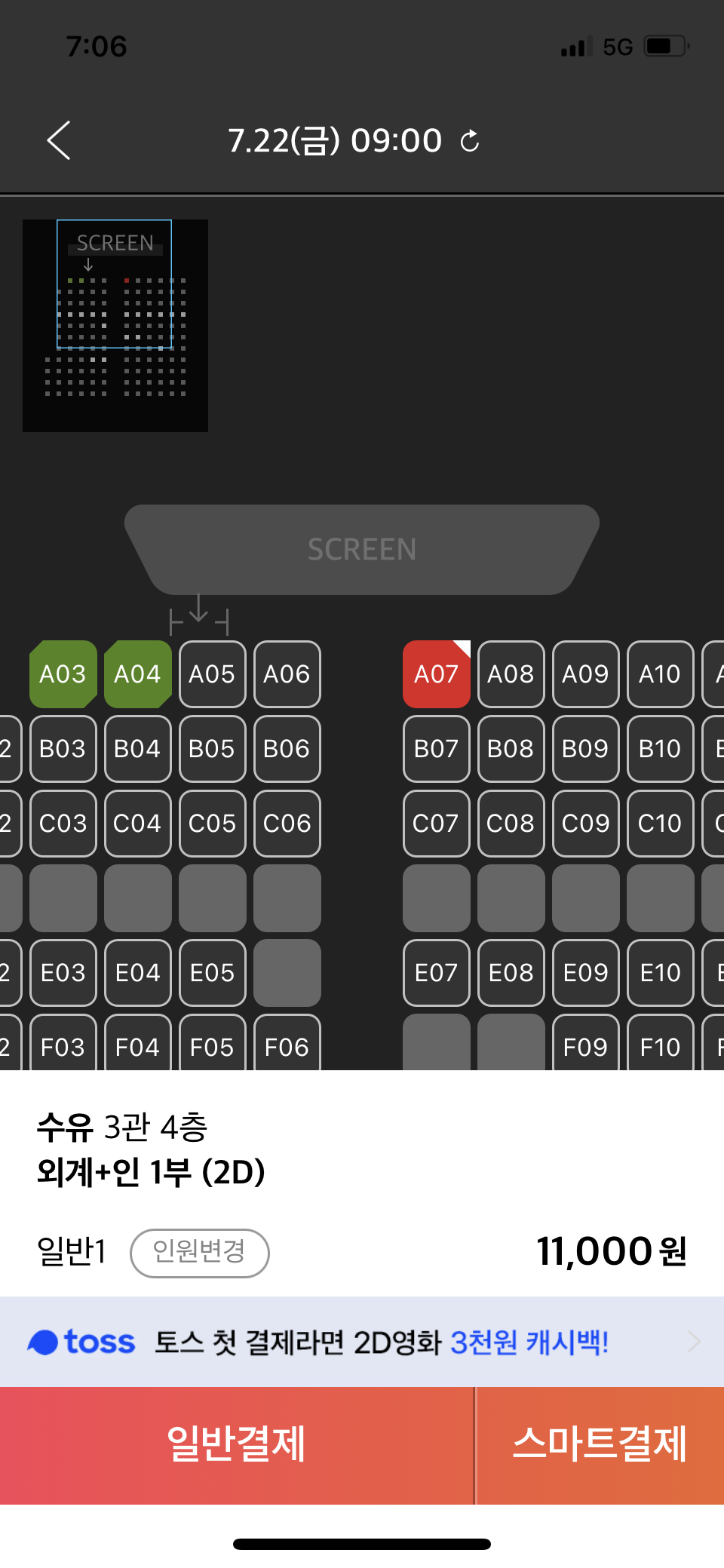 그래서 이번엔 조조 아닌 일반으로 눌러봤더니 중간열은 15,000원 ㅋㅋ 이것이 바로 돈 없으면 뒤에 안지도 말라는 CGV의 좌석 차별제다. 차등제는 개뿔, 차별이잖아 결국.